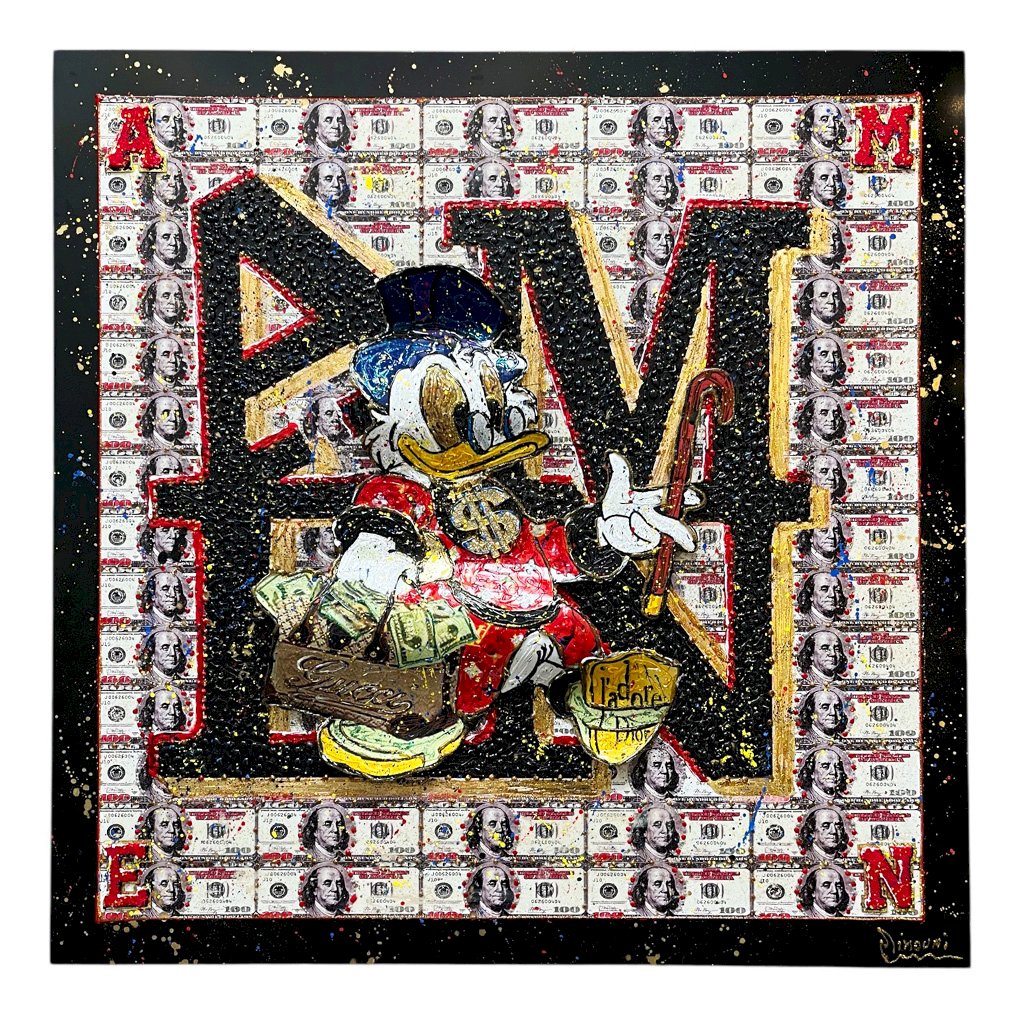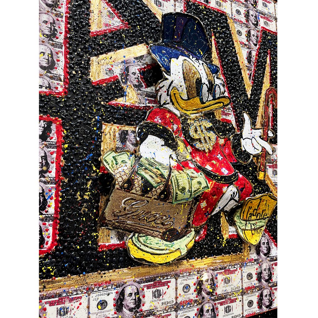 - Patine a la feuille d 'or - Peinture relief - Technique mixte - Picsou relief - Cable d'accroche à l'arrière - Certificat d' authenticité